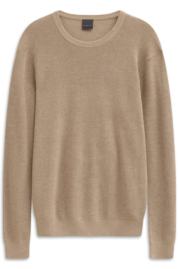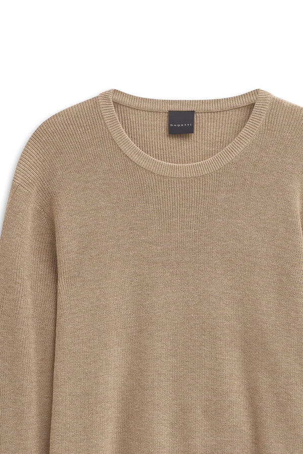 Girocollo color sabbia motivo a treccia alternato a punto grana riso davanti.