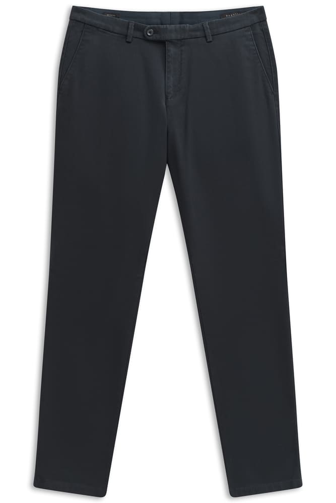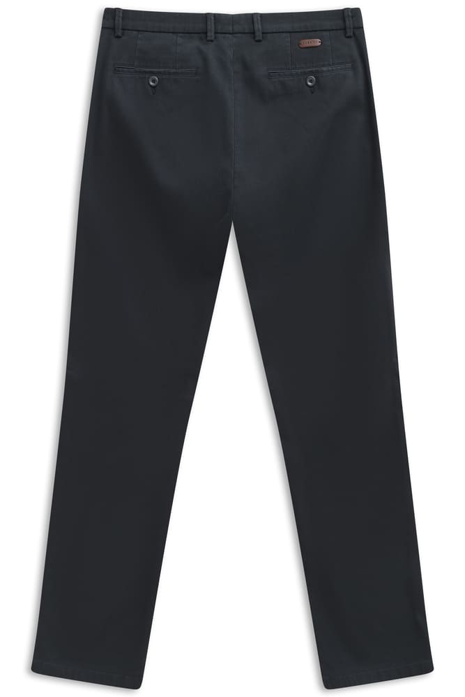 Pantaloni in morbido tessuto operato blu notte, tasche anteriore tipo america, tasche posteriori a filo chiuse da bottoni, larghezza fondo 17 cm.