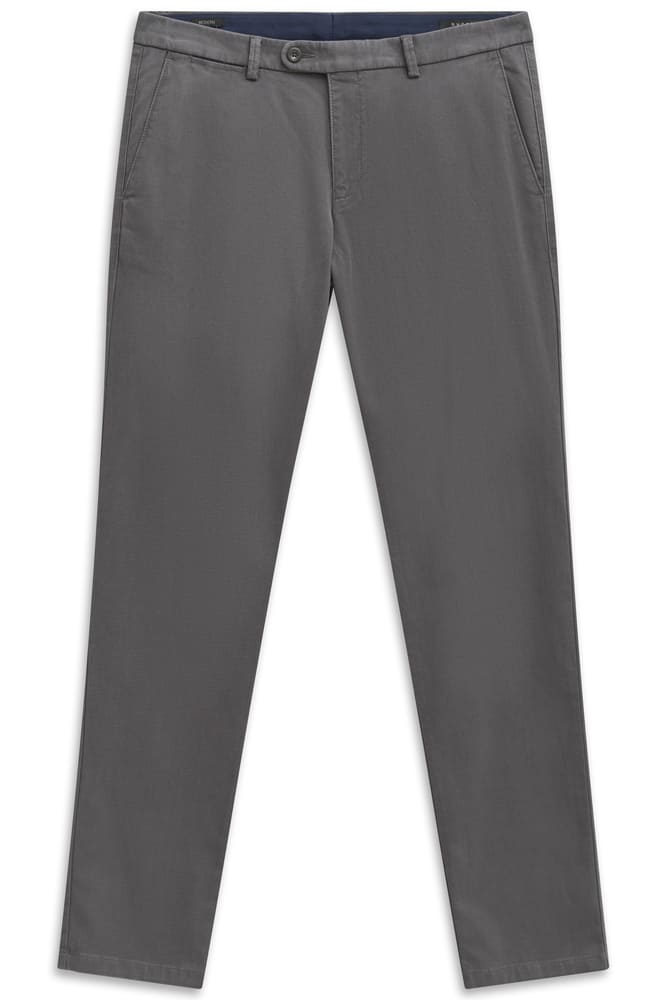 Pantaloni in morbido tessuto operato grigio, tasche anteriore tipo america, tasche posteriori a filo chiuse da bottoni, larghezza fondo 17 cm.