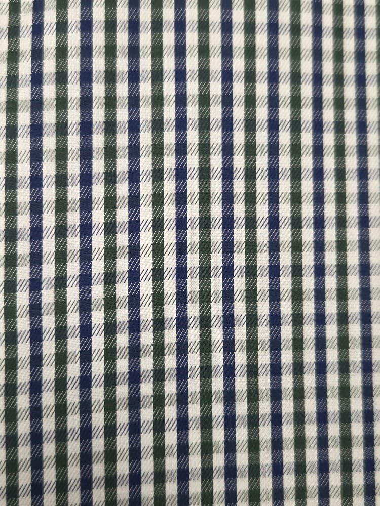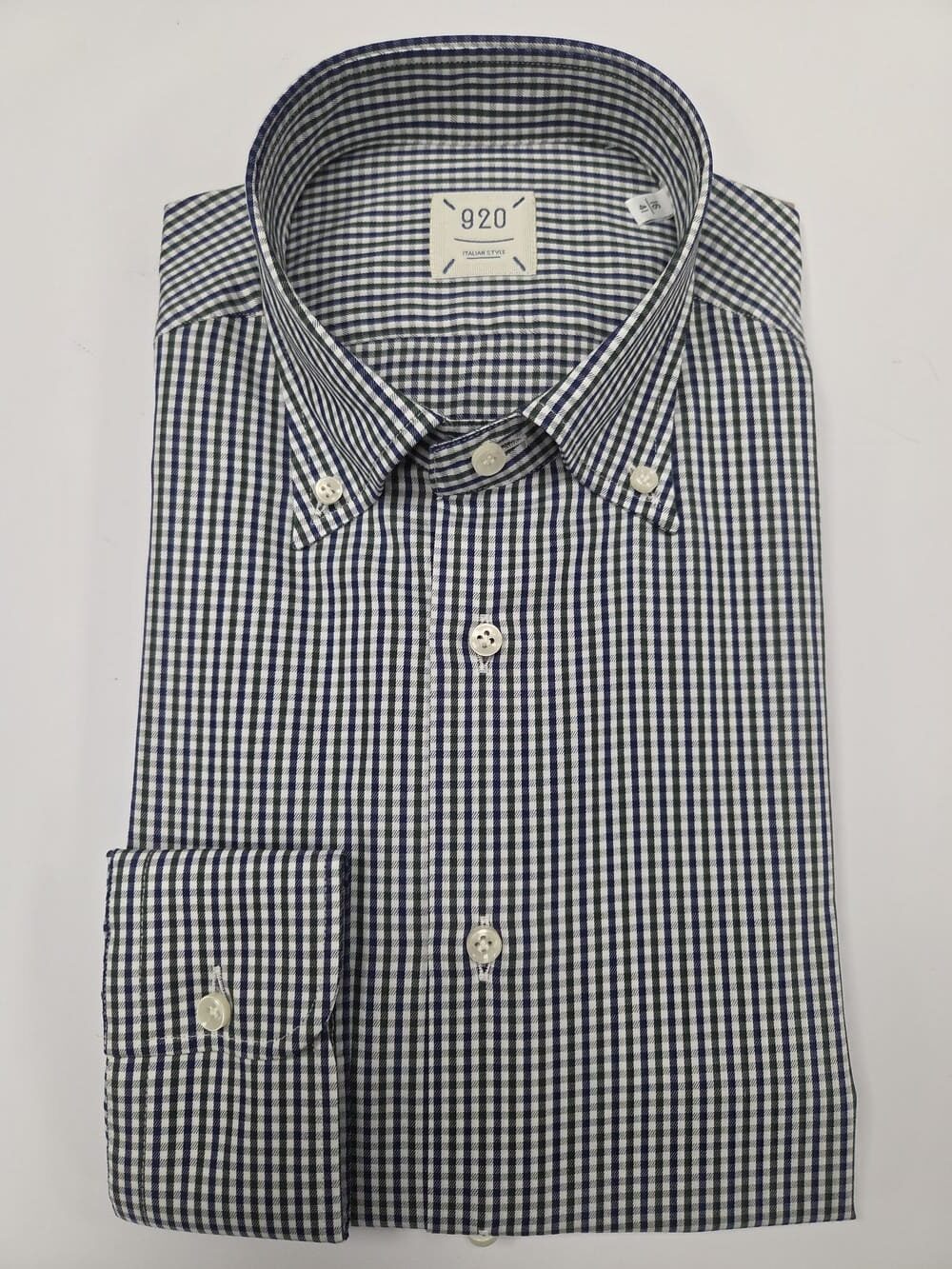 Collo Button-down, vestibilità regolare, senza taschino, polsino stondato con 1 bottone. Tessuto operato quadrettino blu, verde e bianco