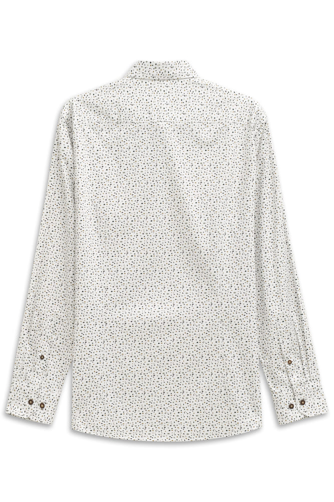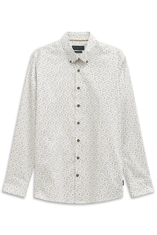 Base bianca motivo “sassolini” colorati nei toni del grigio, verde, marrone ,bottoni in contrasto marroni, collo button-doxn, vestibilità moderna con doppie riprese dietro cucite, polsino smussato con 2 bottoni, senza taschino. Questa camicia non è solo comoda da indossare me è particolarmente facile da stirare grazie alla finitura easy care