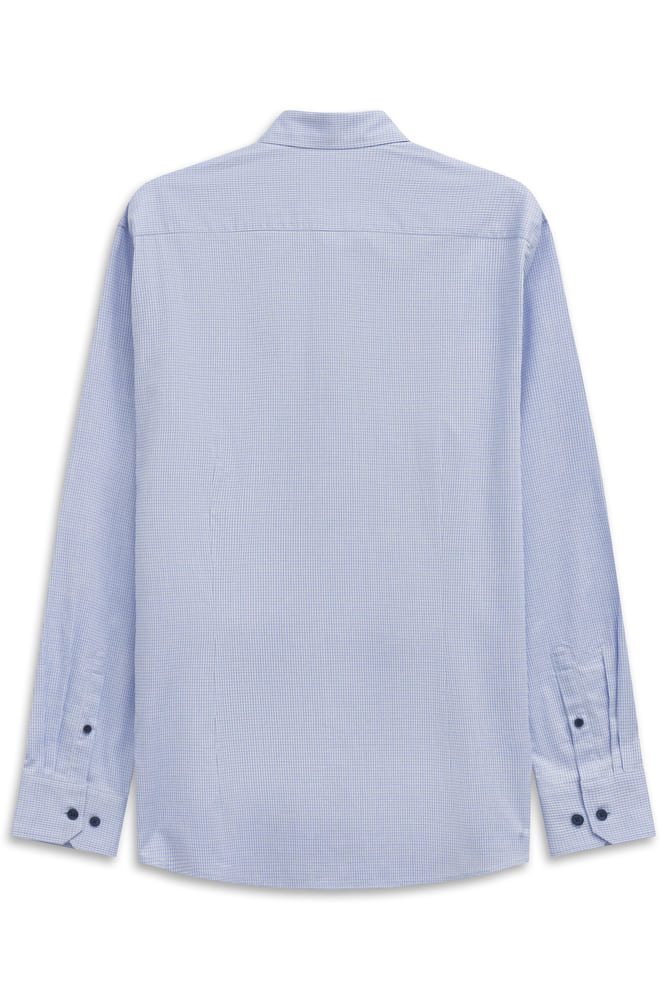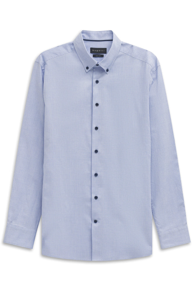 Classica camicia base azzurra con micro quadretto più scuro ,bottoni in contrasto blu, collo button-down, vestibilità moderna con doppie riprese dietro cucite, polsino smussato con 2 bottoni, senza taschino. Questa camicia non è solo comoda da indossare me è particolarmente facile da stirare grazie alla finitura easy care