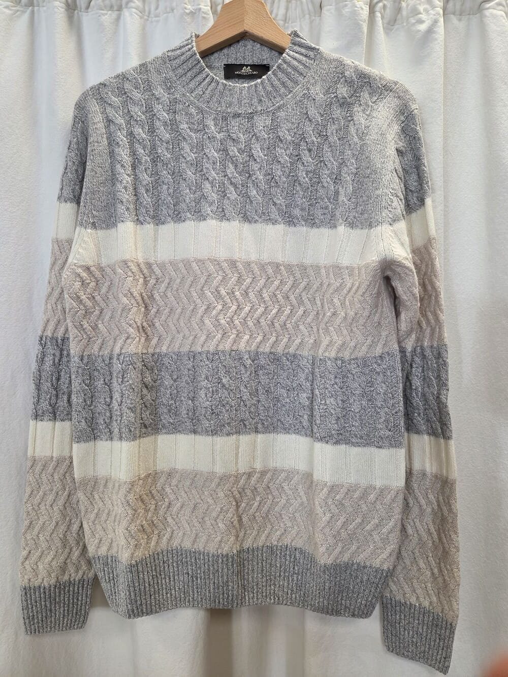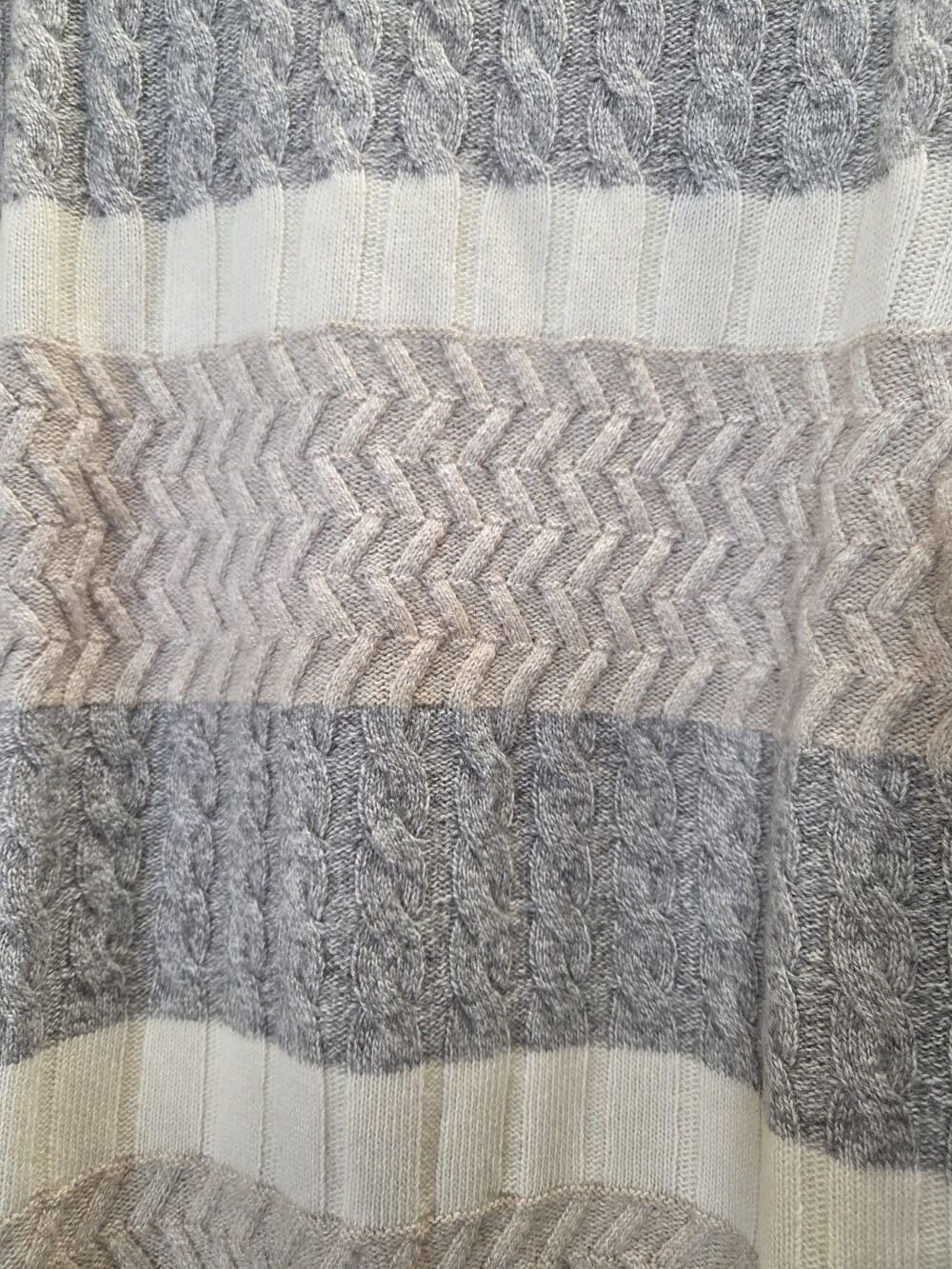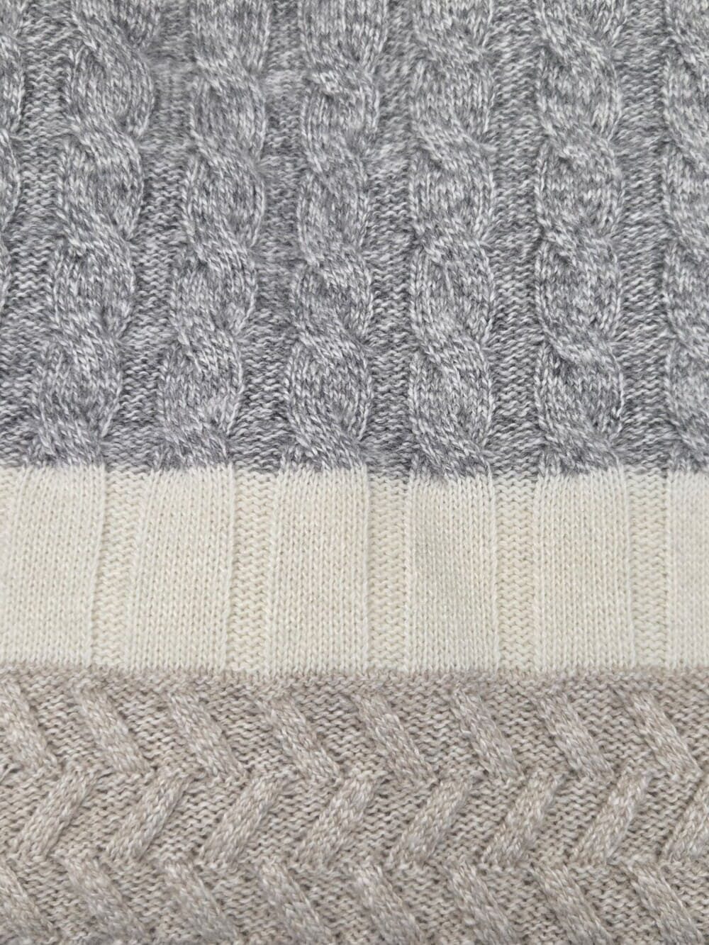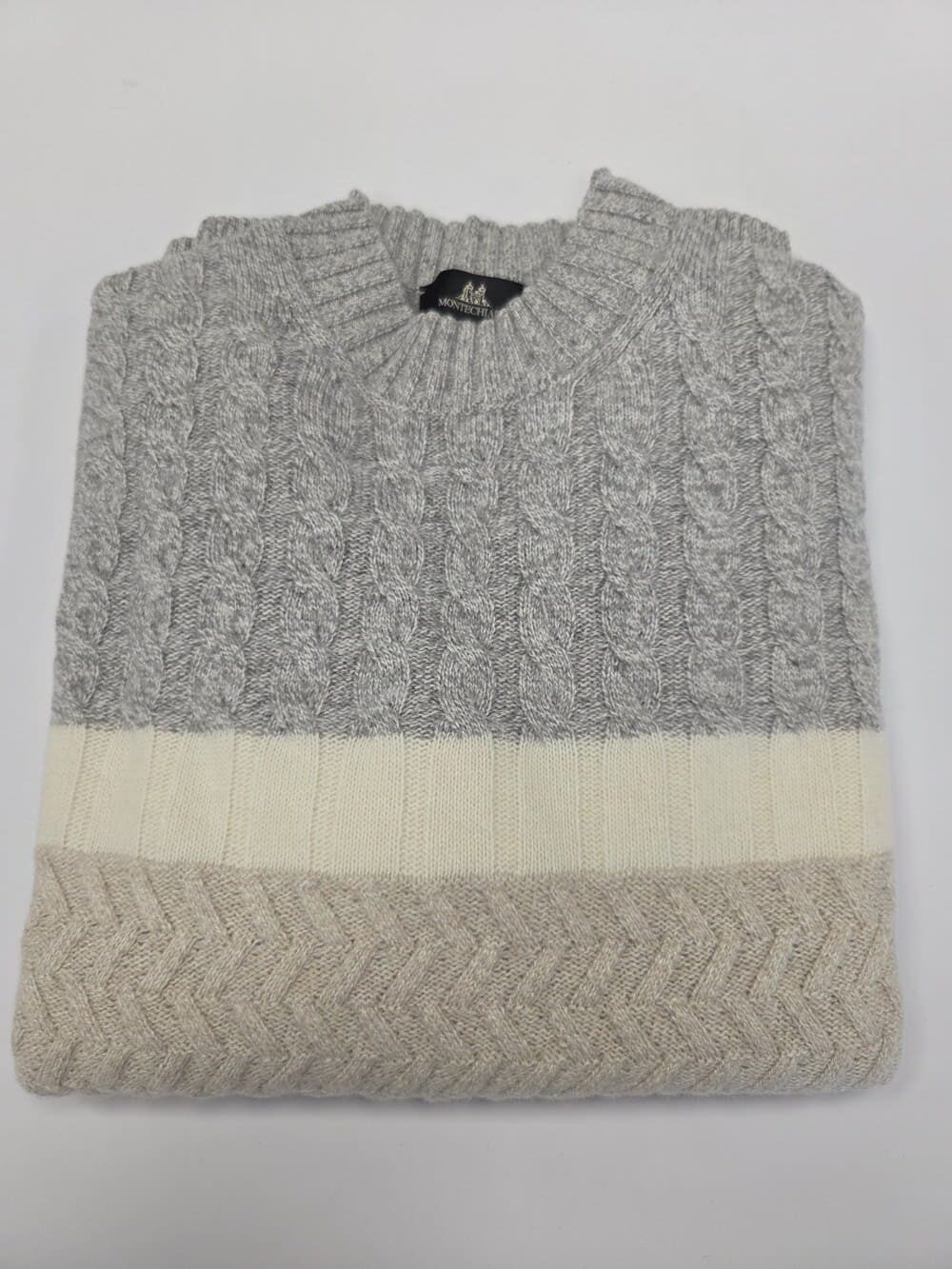 Lupetto realizzato con filati naturali pregiati, operato in modo alternato grigio con trecce, panna , spinato beige