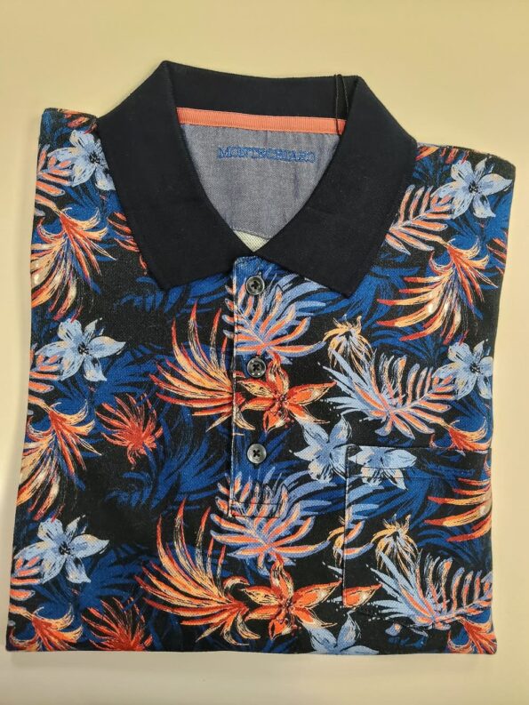 Polo manica corta Montechiaro con taschino, base blu fantasia fiorita colorata, colletto e polsini blu