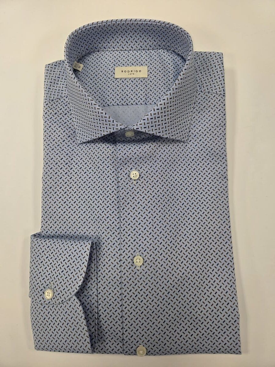 Collo Classico, vestibilità custom, senza taschino, polsino stondato con 1 bottone. Base azzurra piccolo trattino blu e marrone